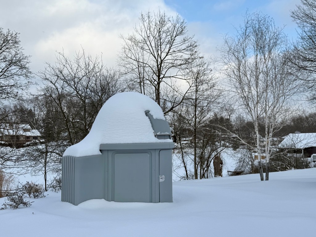 Recent arctic-air frigid weather has brought real winter weather to our region for the first time in a few seasons. Snowfall over the past 48 hours amounted to 10 or 12 inches of light, flaky, fluff. Nighttime below-zero low temperatures have erased any thought of going out; skies have been cloudy, anyway, preventing guilt and regret. So the dome remains sealed though pointed to the south for midday solar observations. If we ever see Sun again.