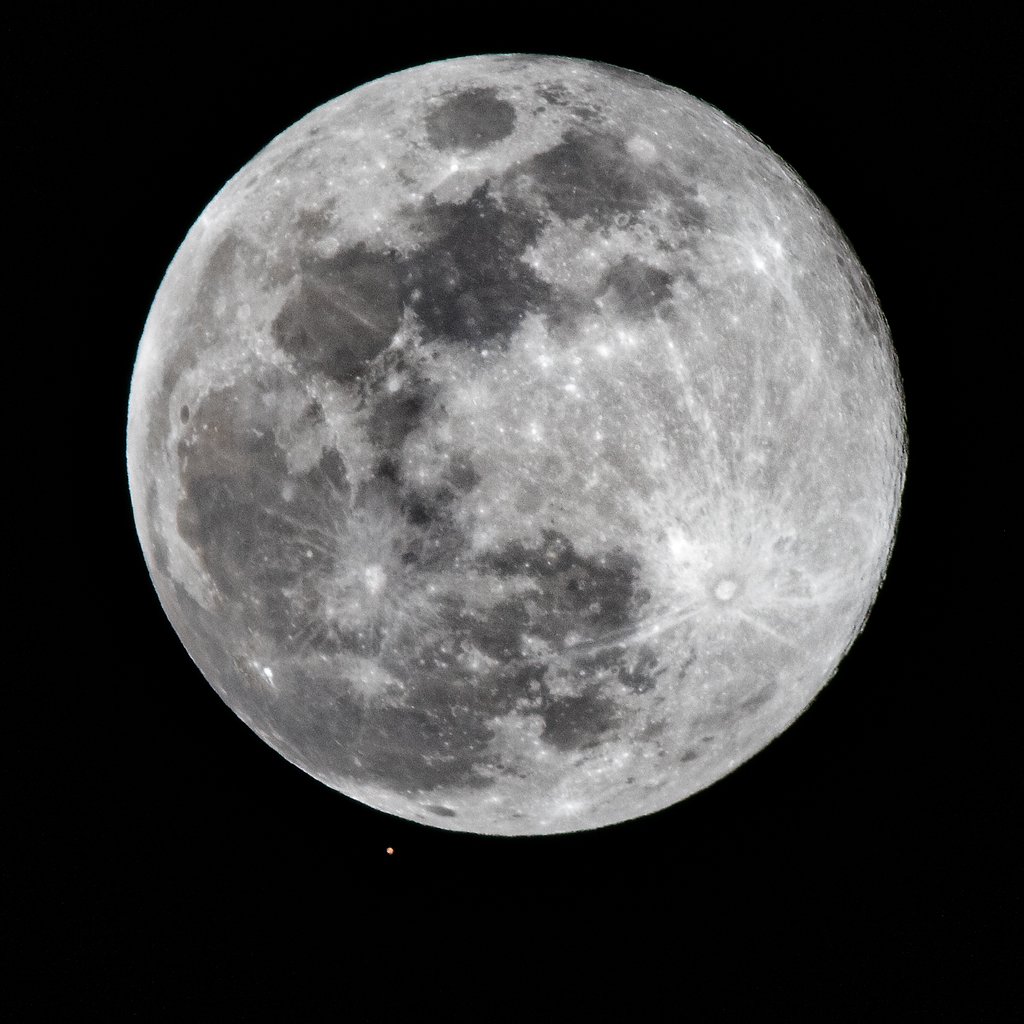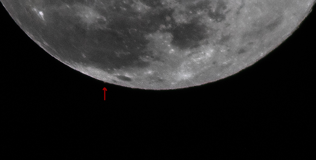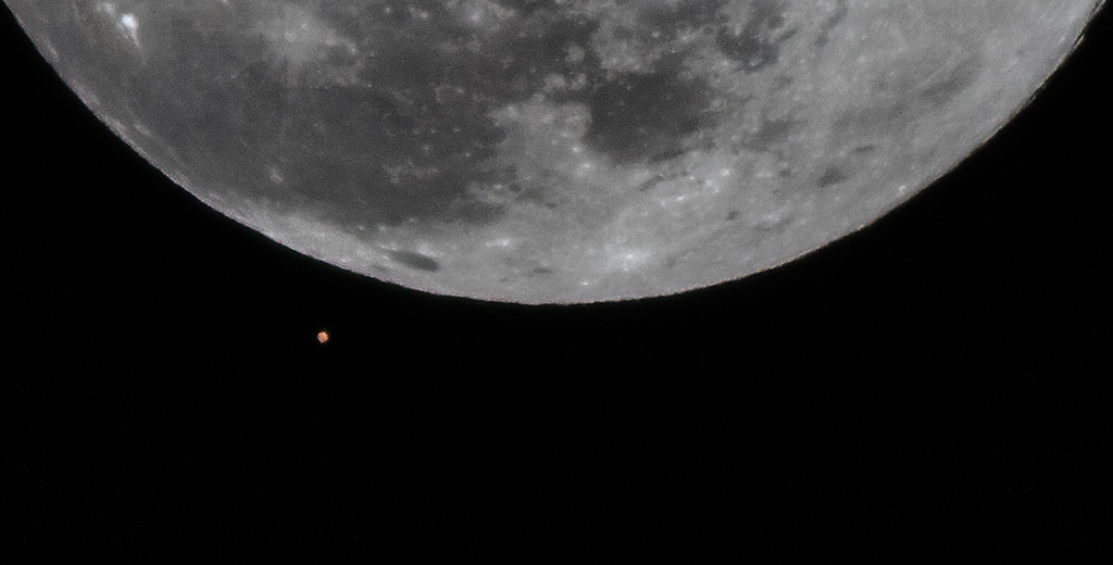 Clouds held off — pretty much — for us to observe the Moon occult* Mars, the reddish dot in the photo above. About once every 14 years or so, everything lines up just right and planet Mars is hidden by Earth’s Moon. Though Mars is about twice as big in diameter as our Moon, it was nearly 60 million miles farther away from Earth during the encounter — to the unaided eye, Mars looked like a tiny bright red star next to the Full Moon.