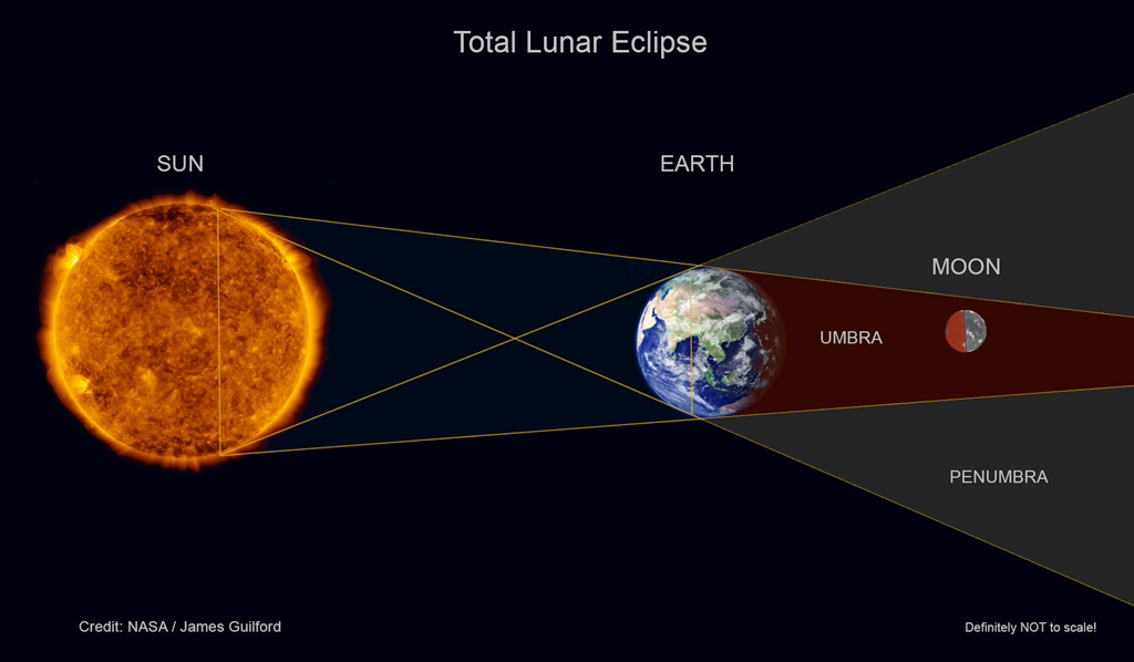 At 2:26 AM, with Moon totally inside the umbra, the spooky beauty will be on full display. Earth’s inner shadow is full of colored light — sunlight scattered through the planet’s atmosphere bearing the scattered colors of the globe’s sunrises and sunsets — the source of a total lunar eclipse’s hues.