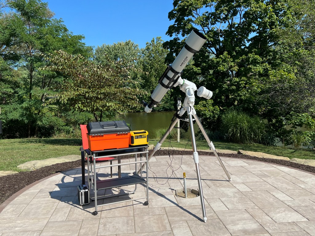 The second experiment involved installing our massive Meade 6-inch telescope on the mount. The Skywatcher has a retractable rod for holding counterweights and is, therefore, a bit shorter than it might otherwise be, resulting in less leverage. It took nearly all of our available counterweights to balance the big scope. We installed the Herschel-Prism and a nice eyepiece and got beautiful views of the spotted face of our star. Attaching the ASI678MM, however, we could not reach focus — that inward focuser travel limit again — but we don’t believe the switch to the 2-inch nosepiece will help. That’s a shame! The Meade’s 1,250mm focal length would have provided amazing closeups!